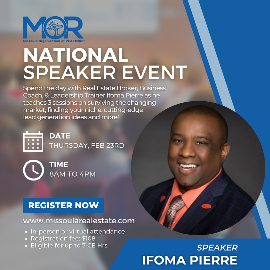 MOR's Professional Development Committee invites you to spend the day with Ifoma Pierre including (3) courses and 7 CE Hrs. When you leave, you'll be armed with business building skills, innovative tech strategies, and critical operating activities that you can put into action immediately. Whether you are a new agent, a team leader or seasoned veteran, there's something in these sessions for everyone. You'll discover exciting new ways to market online, adding value and generating high quality opportunities.